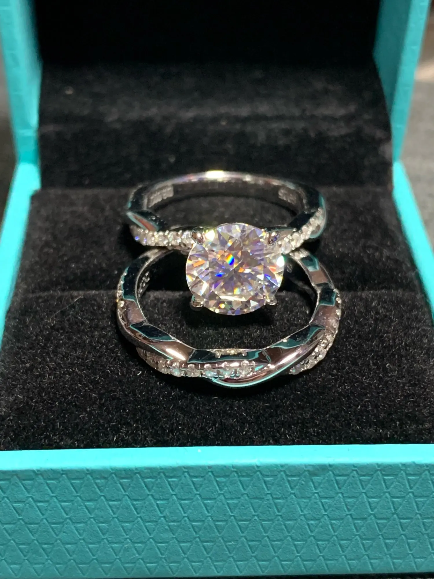 Celebrate your love with the GK Moissanites 3 CTTW D Color Moissanite Bridal Set. This beautifully crafted duo includes a dazzling engagement ring and a perfectly paired wedding band, both featuring brilliant D Color Moissanite stones. With a total carat weight of 3 CTTW and set in premium 925 sterling silver, this bridal set embodies timeless elegance and luxury—ideal for marking your forever moments.