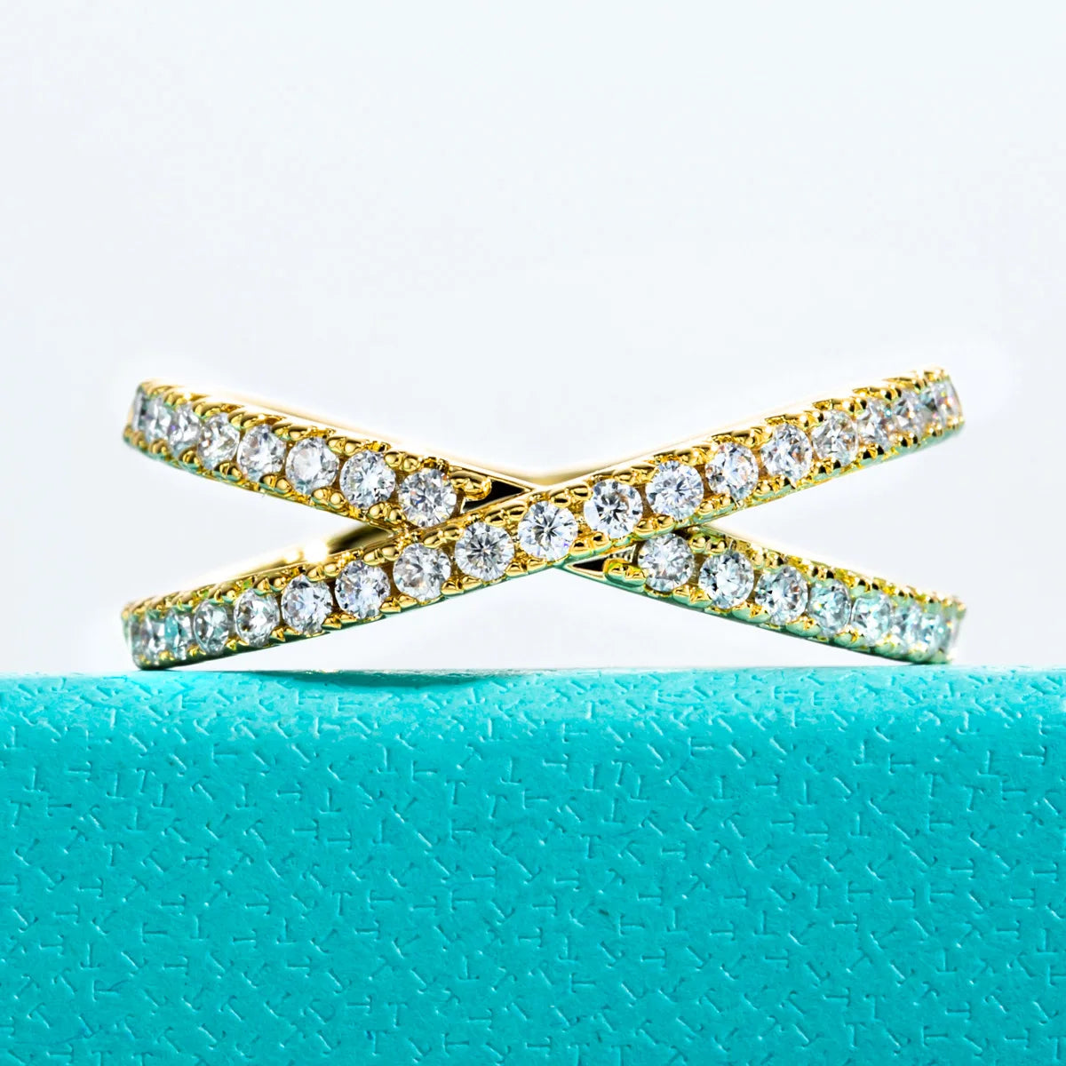 Experience timeless elegance with the GK Moissanites 1.5mm D Color Moissanite X Crossover GRA Certified Wedding Bands. This unique set features two intersecting bands adorned with sparkling 1.5mm D Color Moissanites, creating a captivating X design. Crafted from 925 sterling silver with yellow gold plating, these bands exude luxury and sophistication.