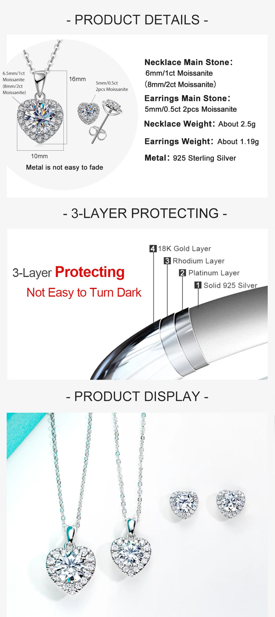 - 1ct Total Weight: Includes a matching necklace and earrings featuring 1ct heart-shaped moissanite stones.