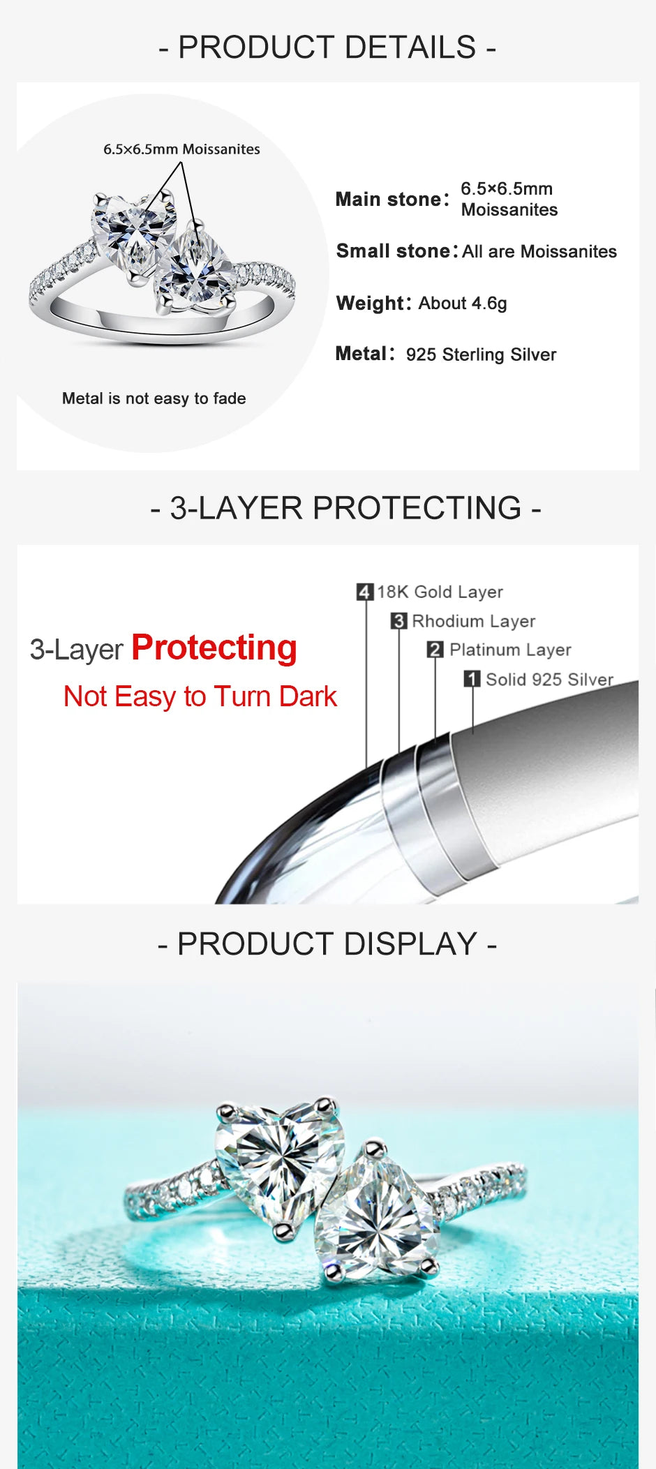 - 2 Carat Heart Moissanite Twins: Two dazzling heart-shaped moissanite stones symbolize love and devotion, creating a captivating sparkle that rivals traditional diamonds.