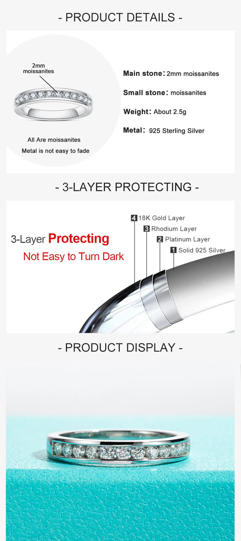Premium Moissanite: 2mm round-cut D Color moissanite stones for a radiant glow.