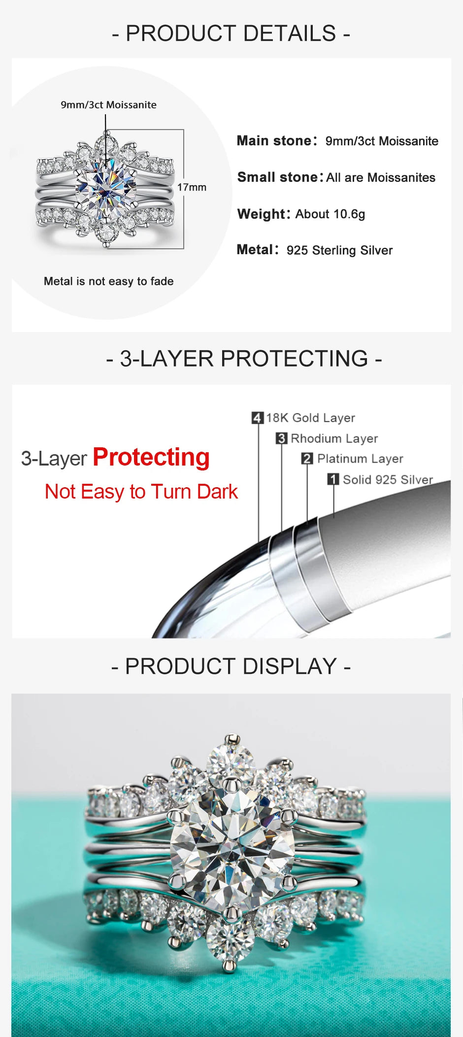 - 18K Gold Plated & 925 Sterling Silver: This set combines the luxurious look of 18K gold with the durability of sterling silver, providing a ring that’s both stunning and long-lasting.