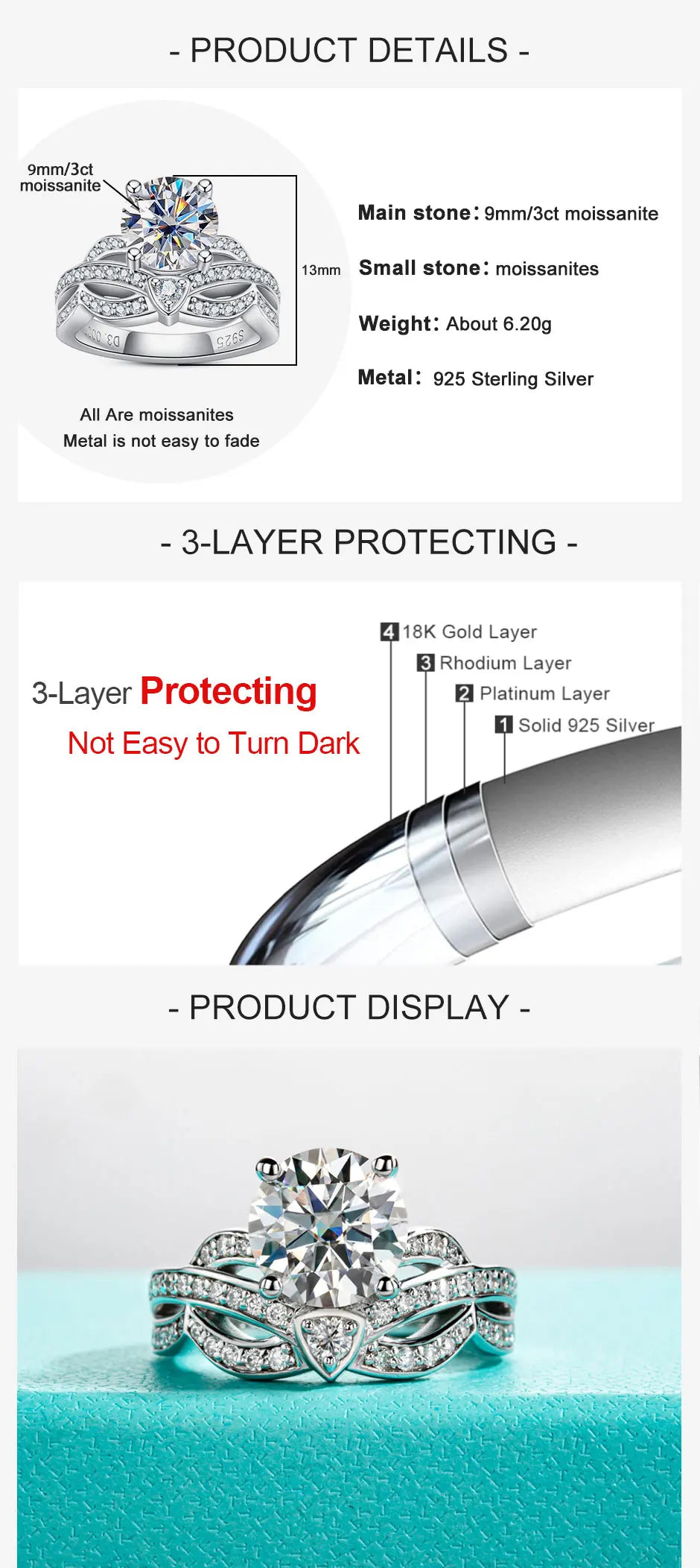 - 3ct Moissanite: A brilliant 3-carat moissanite stone with dazzling clarity, set to capture light from every angle.