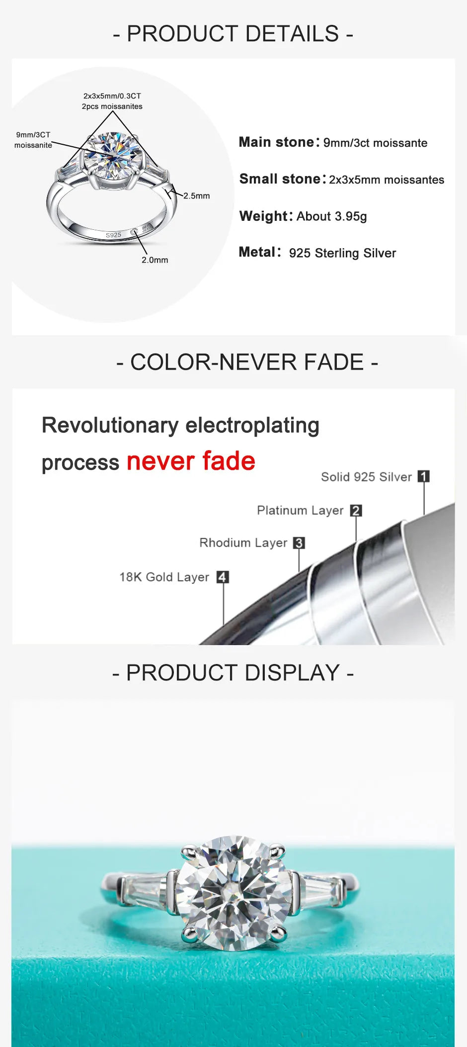 - 3 Carat D Color Moissanite: Features three sparkling stones that reflect light beautifully, creating an eye-catching brilliance that rivals traditional diamonds.