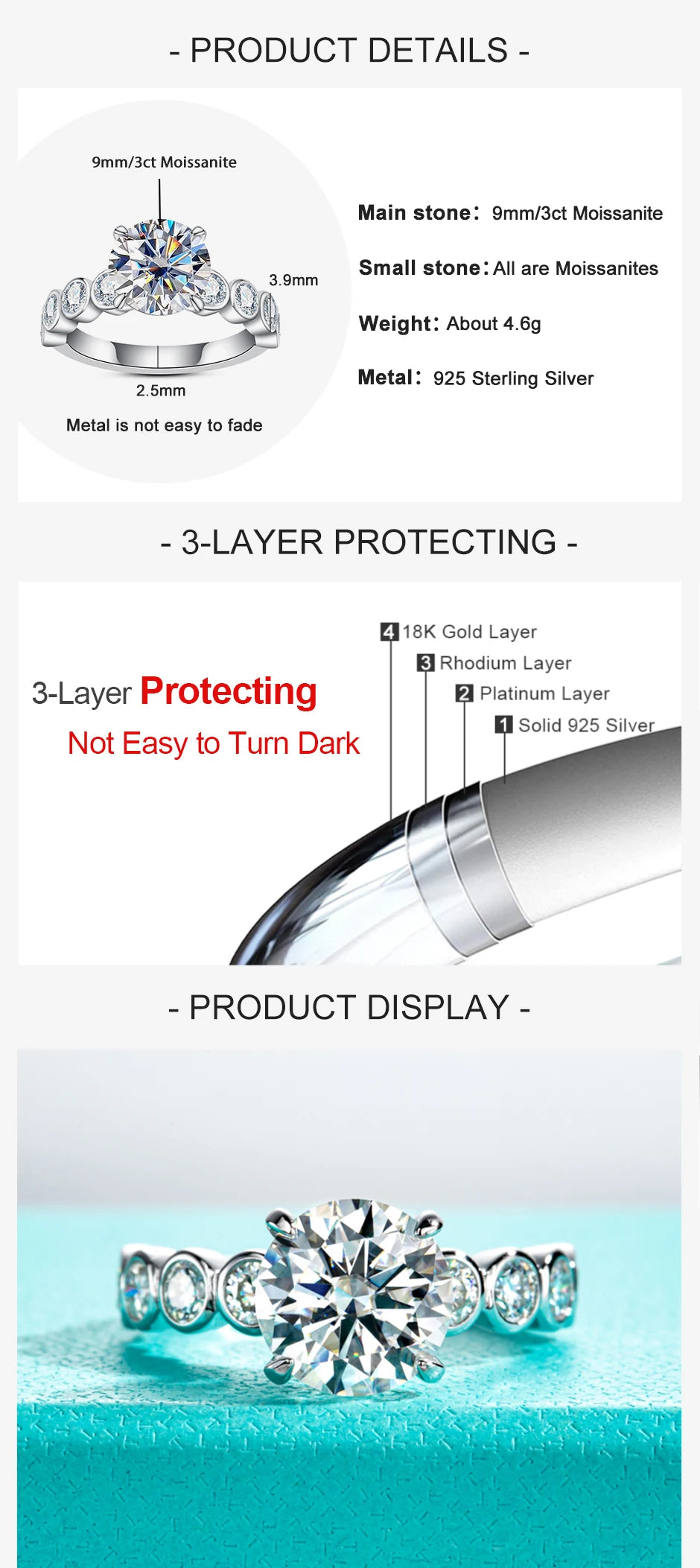 - 3 CT Moissanite: The eye-catching 3-carat center stone provides a striking presence, radiating fire and brilliance that captures attention from every angle.
