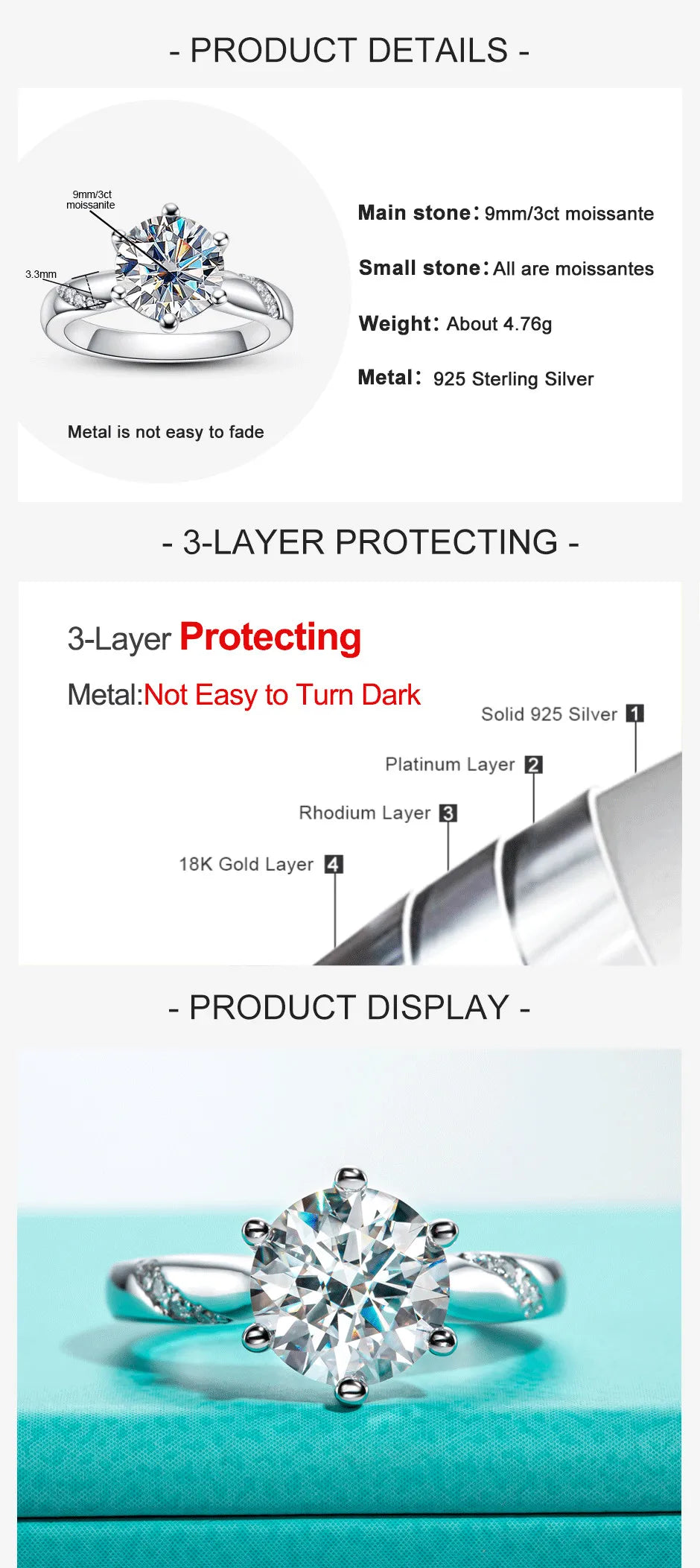 - 3ct Round Cut Moissanite: A dazzling 3-carat round-cut moissanite that offers exceptional brilliance and sparkle.