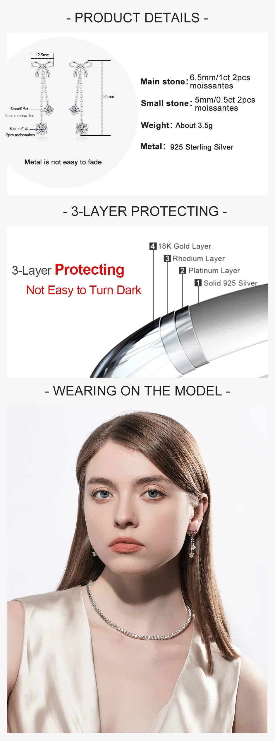 Add a touch of elegance to your look with these 3cttw D Color Moissanite Diamond Bow Drop Earrings. Featuring a charming bow design, these earrings are adorned with D Color, VVS1 clarity moissanite stones, creating a dazzling effect. Crafted from 925 Sterling Silver, they combine style with durability, making them perfect for both special occasions and everyday wear.