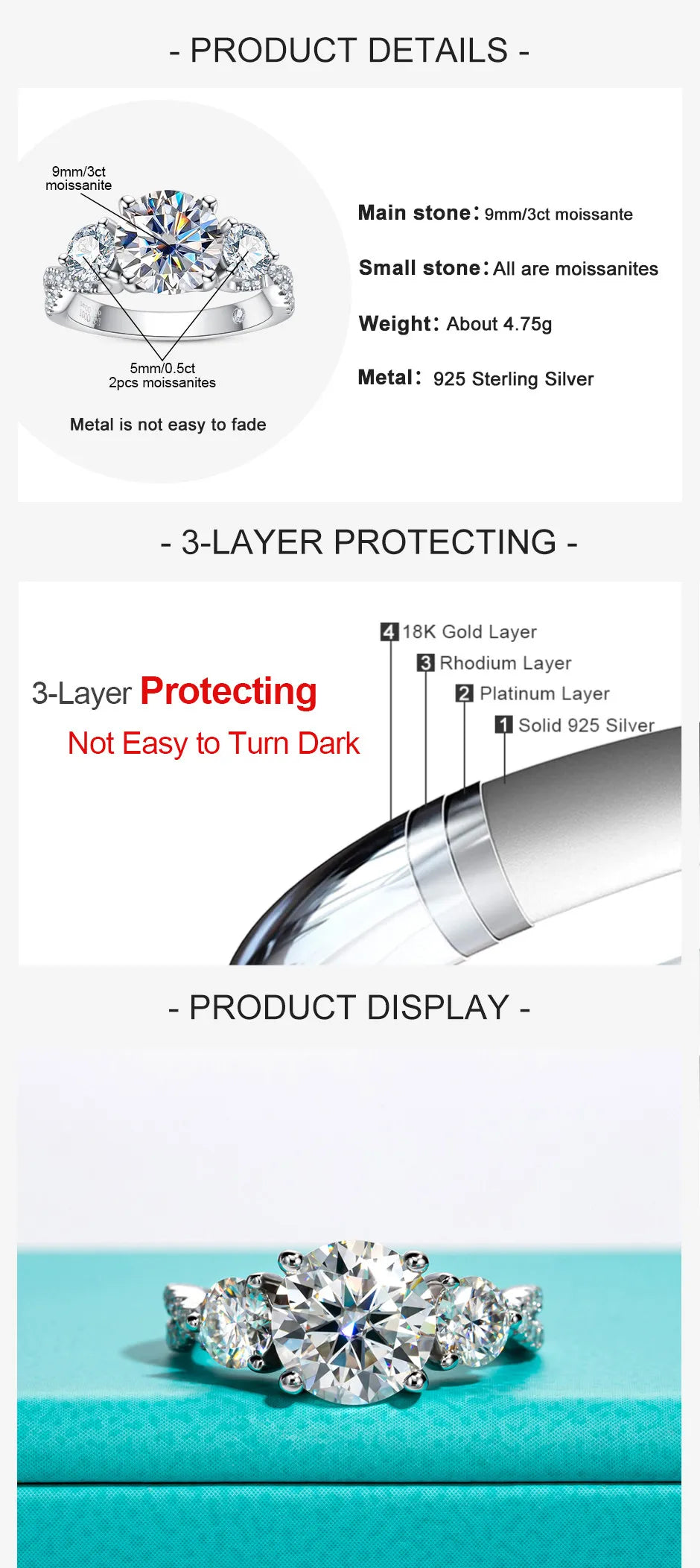 - 4.25ct Total Carat Weight (cttw): Three stunning moissanite stones with a total weight of 4.25 carats, offering maximum sparkle and brilliance.