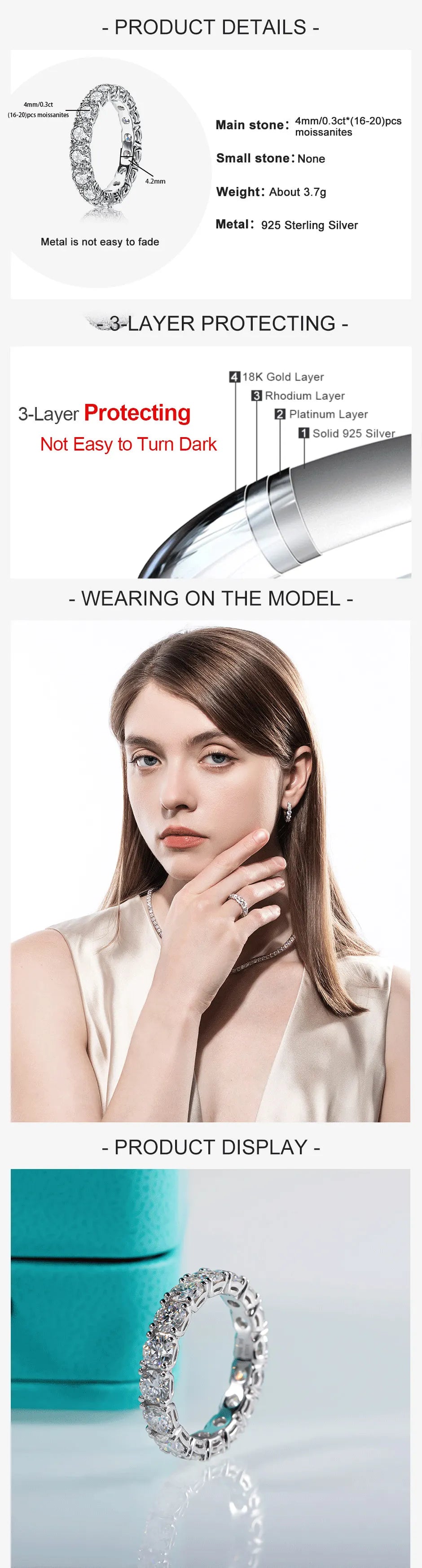 - Premium Moissanite: 4mm D Color Moissanite stones for exceptional brilliance.