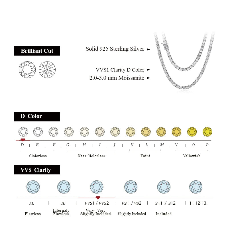 Add a touch of elegance to your jewelry collection with the 3.0MM VVS1 Tennis Cut Moissanite Necklace, expertly crafted from S925 Sterling Silver. This beautiful necklace features stunning 3.0MM VVS1 tennis cut Moissanite stones that sparkle brilliantly, creating a classic and sophisticated look. Its timeless design makes it the perfect accessory for both everyday wear and special occasions.