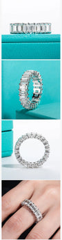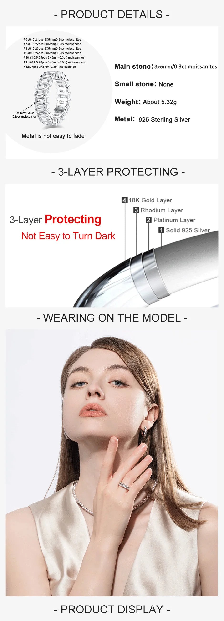 Experience timeless elegance with the GK Moissanites Emerald-Cut Moissanite Eternity Ring. This exquisite band showcases a continuous row of 3×5mm emerald-cut D Color Moissanites, totaling 8.1cttw, meticulously set in 925 sterling silver for a luxurious and sophisticated appeal.
