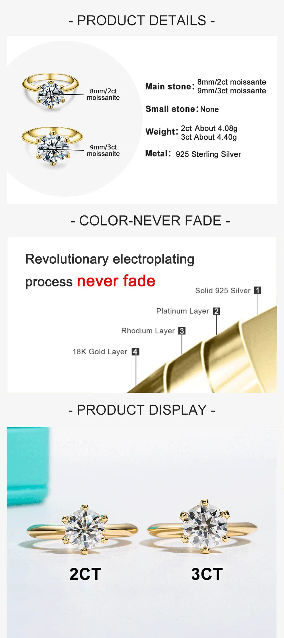 Experience timeless beauty with this Yellow Gold Plated Moissanite Solitaire Ring. Available in 2CT or 3CT, the dazzling D Color moissanite stone takes center stage, showcasing unmatched brilliance. Crafted for elegance and durability, this engagement ring is perfect for celebrating love and commitment.